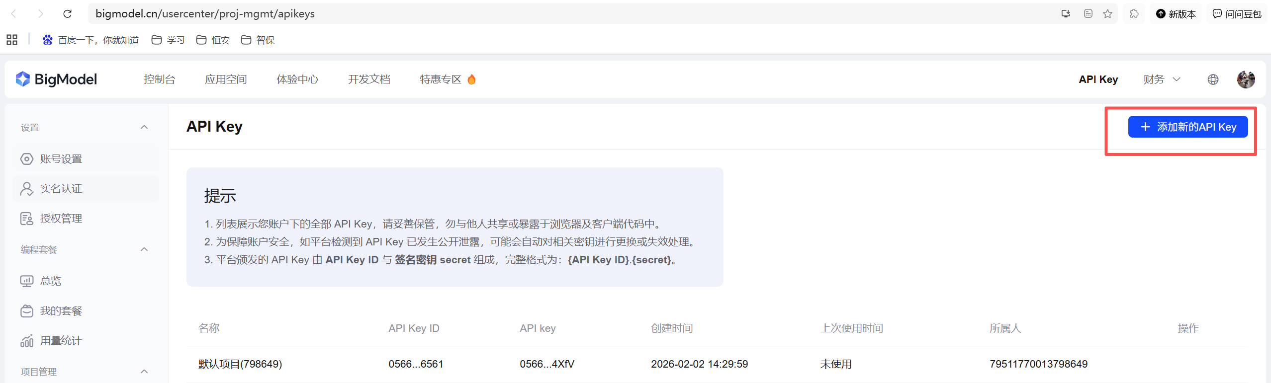 以智谱为例,在智谱AI开放平台创建apiKey