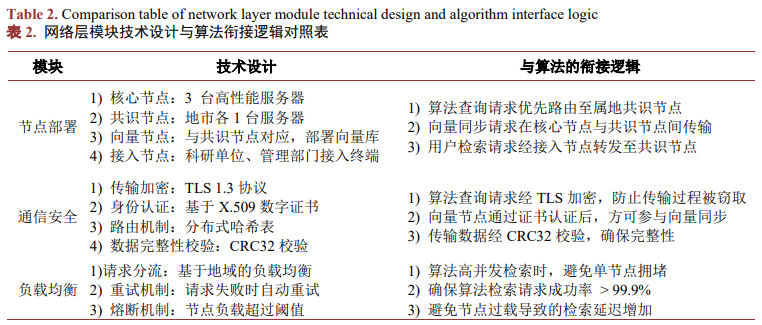 基于电子政务外网构建P2P分布式网络,为算法请求提供安全、高效的传输通道,支撑算法的实时性需求。网络层主要包含节点部署、通信安全与负载均衡三大模块,具体设计如表2所示: