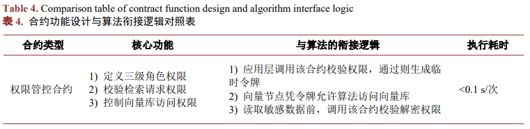 基于Hyperledger Fabric智能合约框架,设计6类核心智能合约,将算法的"权限校验--流程执行--结果脱敏--日志记录--预警预测"全流程固化为智能合约逻辑,确保算法合规落地与安全可控。设计如表4所示: