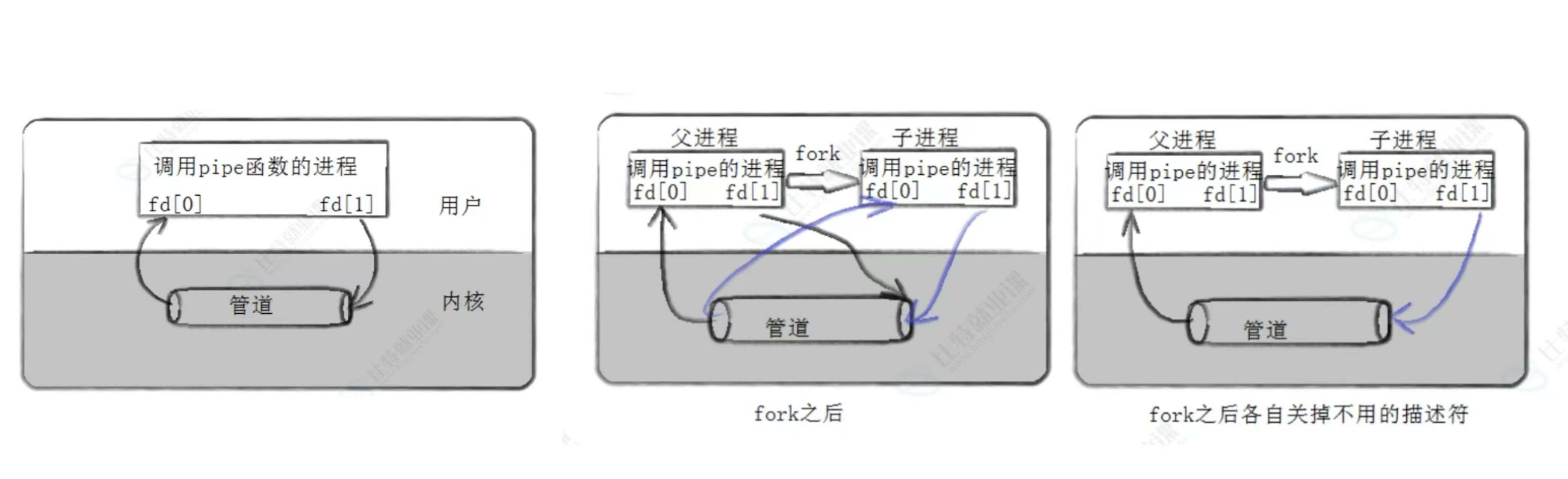 - 父进程创建管道:父进程调用pipe创建管道,持有fd[0](读)和fd[1](写)两个文件描述符;
