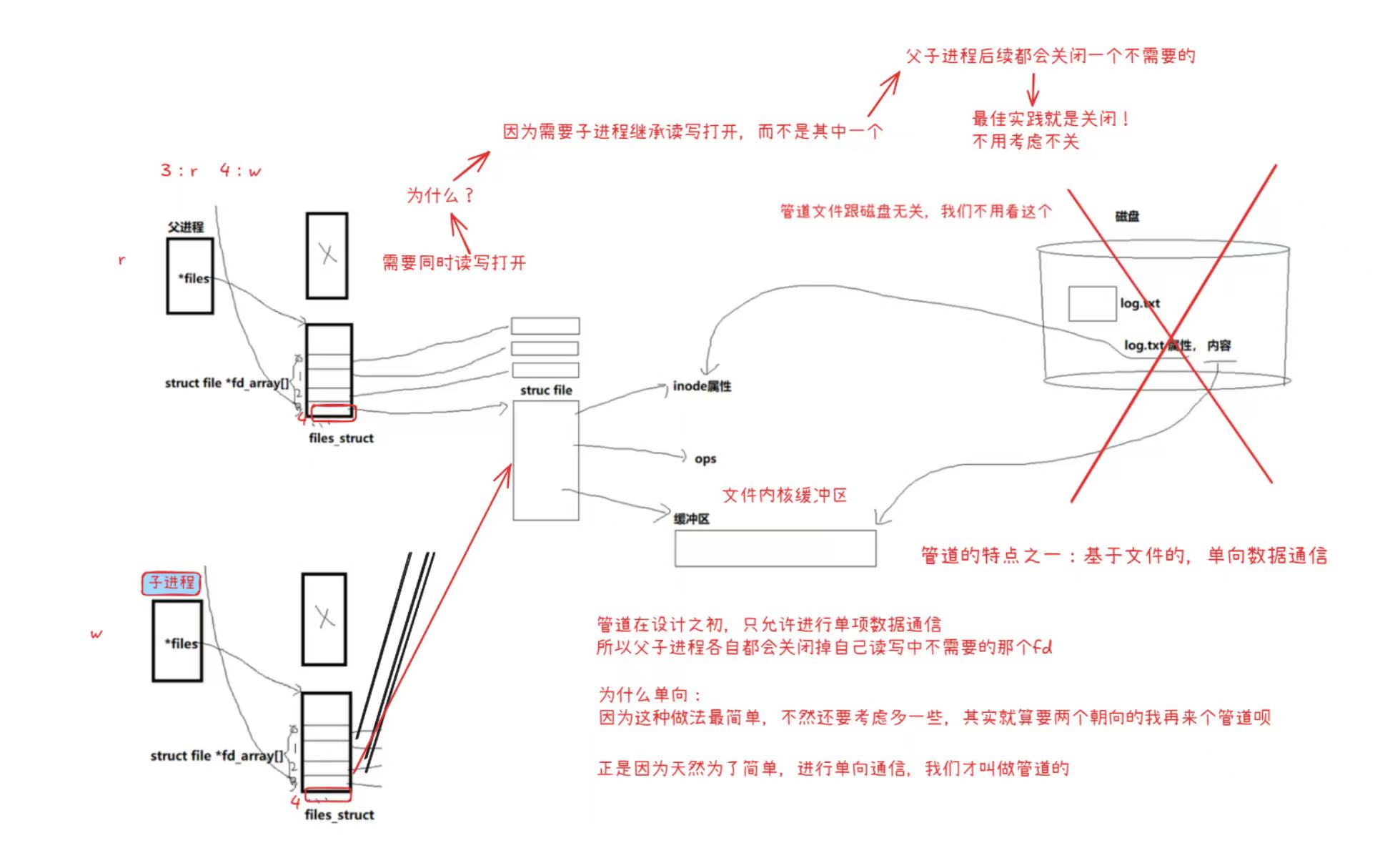 创管道→fork 子进程→关闭无用文件描述符→读写通信→关闭描述符,关闭无用描述符是保证单向通信的关键; - 从文件描述符视角,父子进程的文件描述符指向同一个内核管道缓冲区;从内核视角,管道是由两个