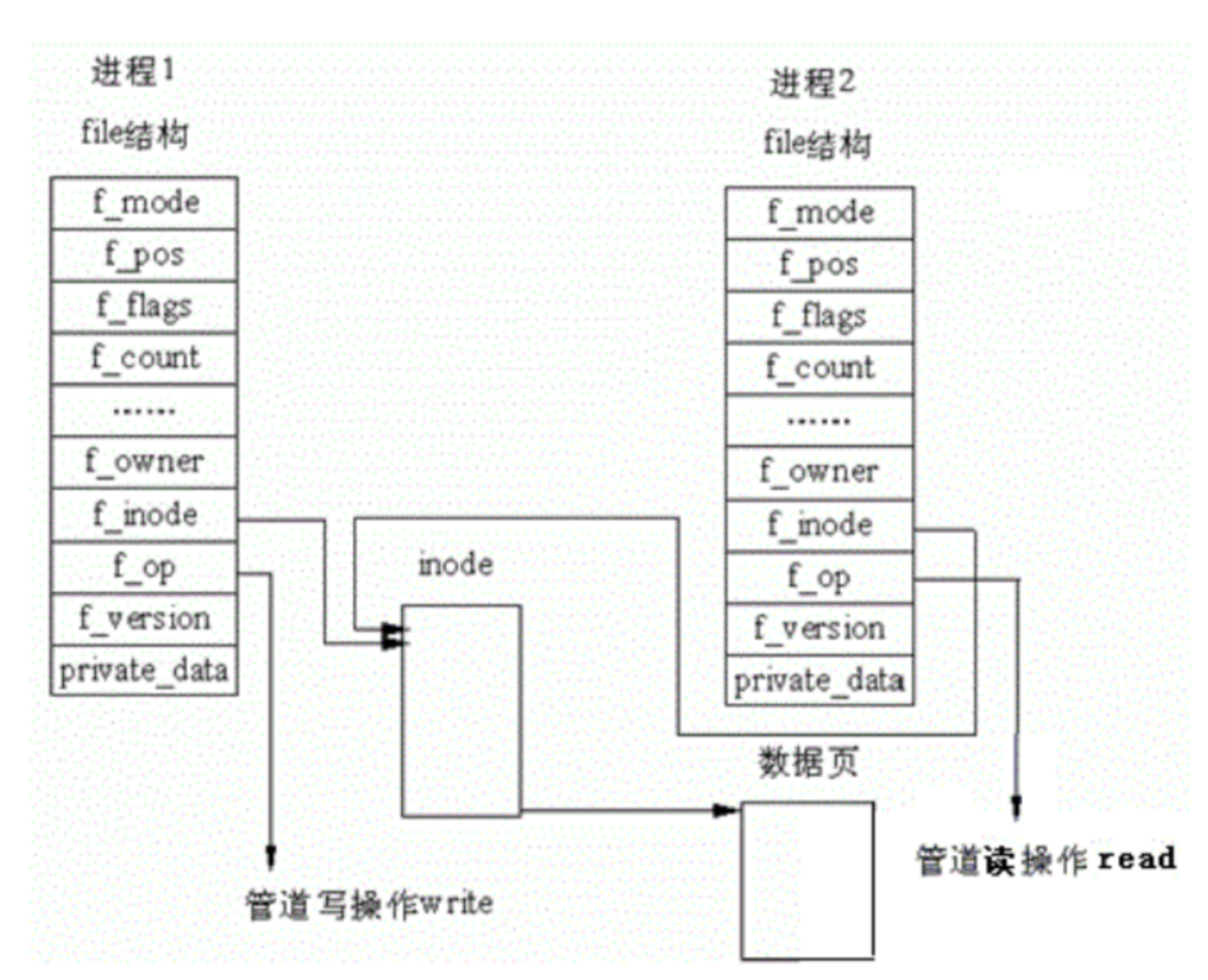 file结构体 :进程的文件描述符表中的每个项都指向一个file结构体,记录文件的操作方式、当前偏移量等信息;inode结构体 :用于描述文件的物理属性,管道的inode中保存了管道缓冲区的地址、大小、读写位置等核心信息;- 管道缓冲区:内核中的一块连续内存,是管道实际存储数据的地方。