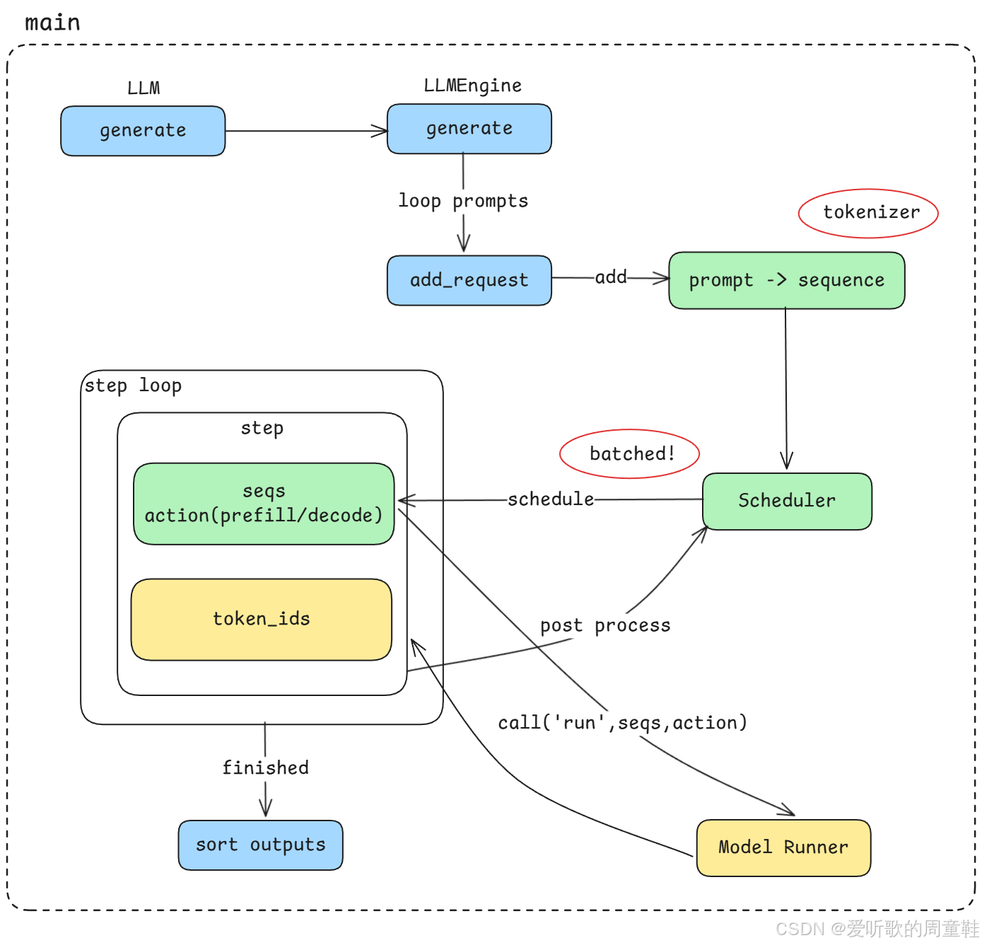 整个推理流程会不断重复这个 step loop,直到所有 sequence 都完成生成。