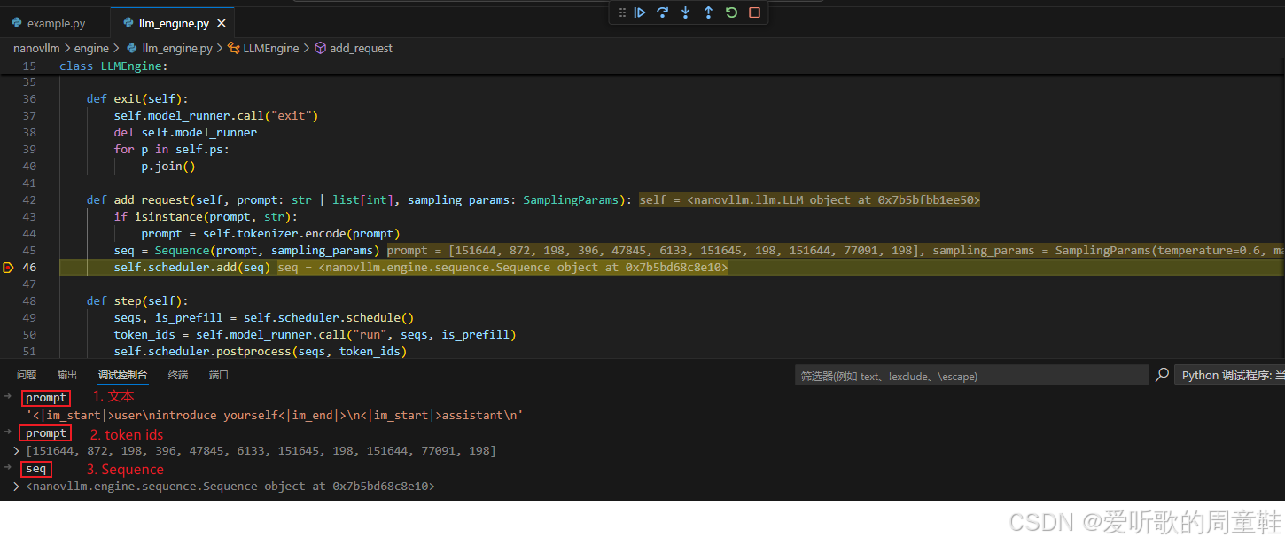 当输入的 prompt 被 tokenizer 处理之后,就会被转换为一个 sequence 对象,并加入到推理系统中进行调度。