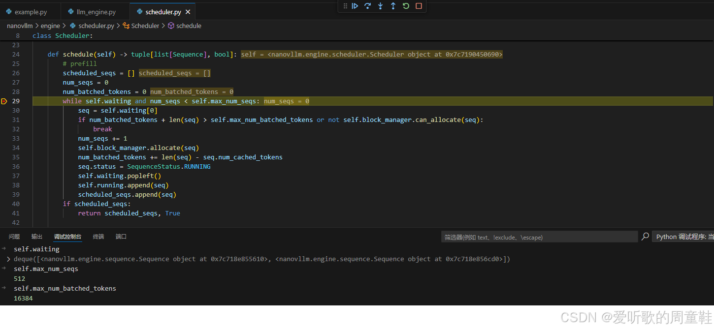 当新的请求(sequence)进入系统时,会首先被加入到 waiting 队列 中;随后,Scheduler 会根据当前资源情况和调度策略,将部分 sequence 调度到 running 队列 中执行。