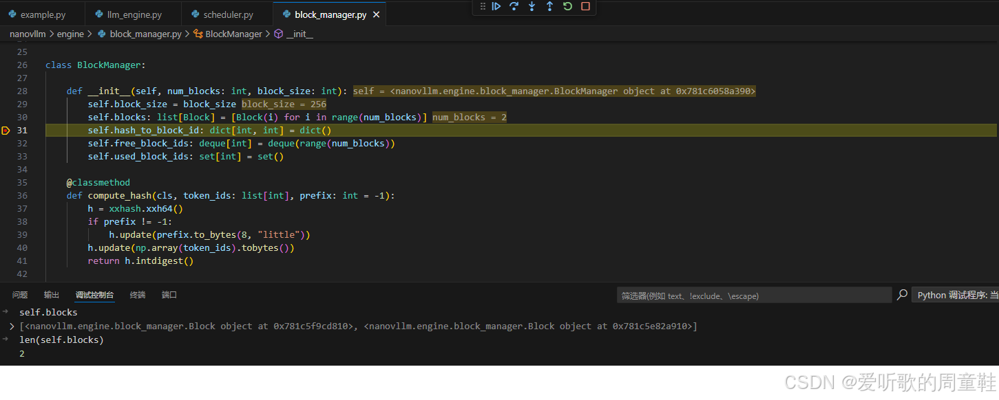 接着我们分析了 Block Manager 的设计。这个模块本质上是 KV Cache 的 CPU 侧控制器,它通过 block、hash、引用计数以及 free/used block id 等数据结构,把底层显存中的缓存状态抽象成了一套可以高效管理的逻辑结构。通过这一层设计,我们也进一步理解了 sequence 和 block 的区别,以及 block 级缓存复用在整个推理系统中的意义。