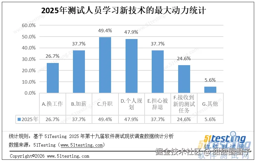 软件测试从业人员学习测试新技术的最大动力是升职,其次是个人规划。