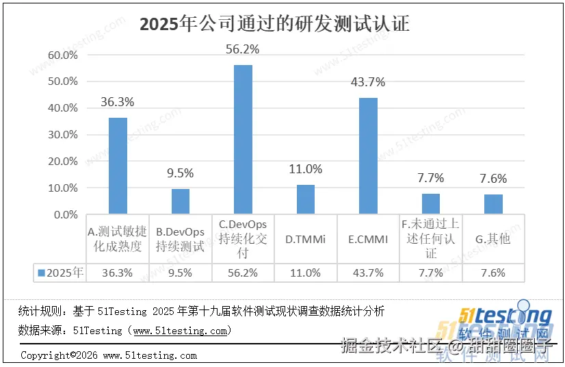 · DevOps持续测试与TMMi占比较低,分别为9.5%与11.0%,反映专门针对测试环节的深度认证推进仍处于初步阶段;