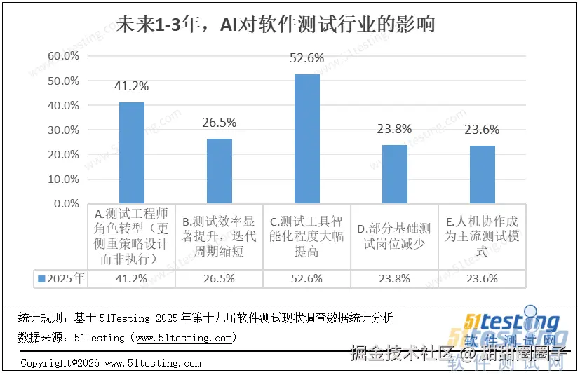 行业普遍认为AI对测试行业的最大影响是测试工具智能化大幅提升,这是AI落地最直接的切入点,契合行业需求。工具智能化也推动测试工程师向策略设计转型,成为从业者关注重点,这是AI承接基础执行工作后的必然职业趋势。