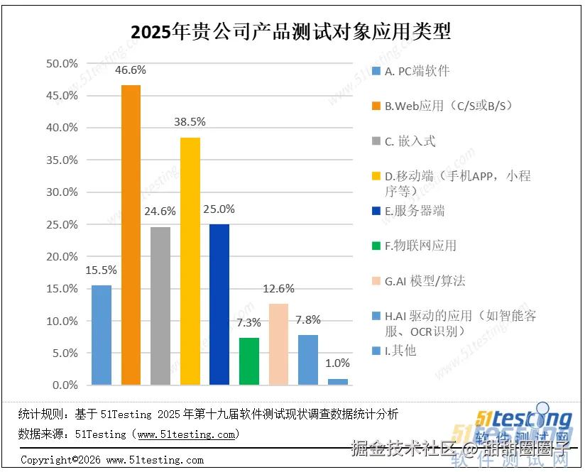 · Web应用(C/S或B/S)占比最高,达46.6%,为当前最核心的测试应用类型;
