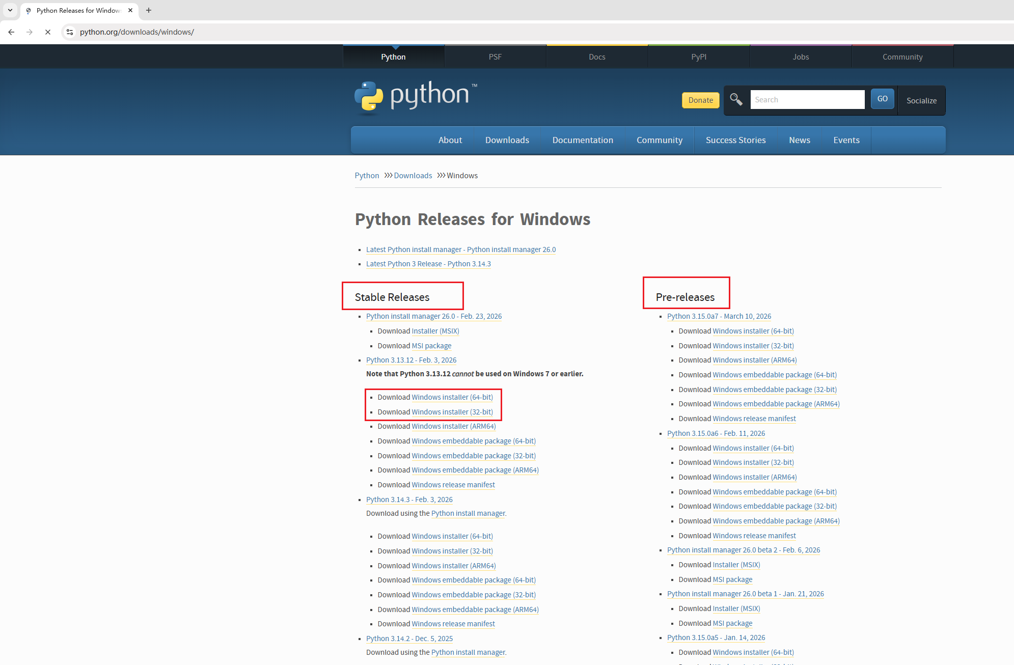 如果不想下载最新版本,点击Downloads下的Windows可以看到所有版本的Python,其中左边的StableReleases对应的是稳定版本,右边Pre-releases对应的是提前测试版,不建议下载