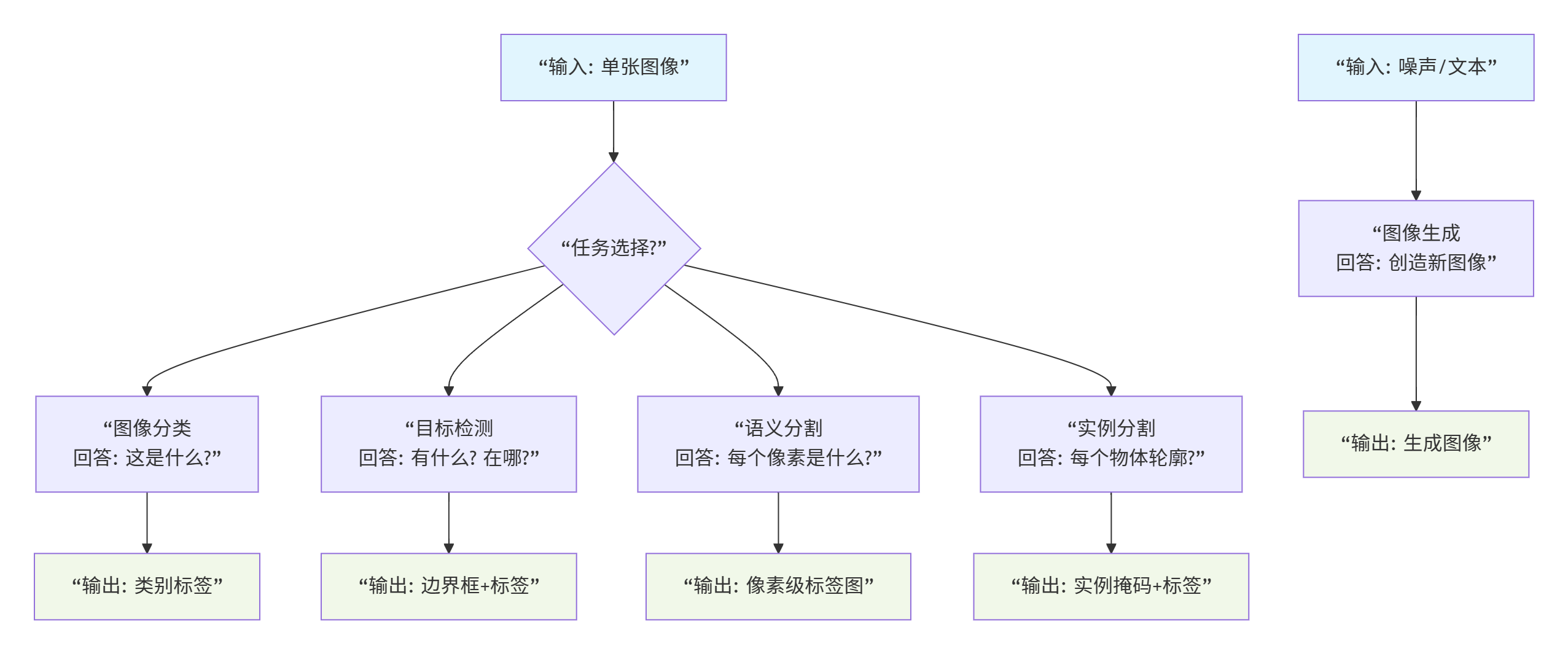 | 核心信息 | "是什么" | "有什么,在哪" | "每个区域是什么" | "每个物体轮廓" | "创造新内容" |