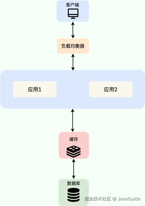 如下图所示,就是一个简单的使用分布式缓存的架构图。我们使用 Nginx 来做负载均衡,部署两个相同的应用到服务器,两个服务使用同一个数据库和缓存。