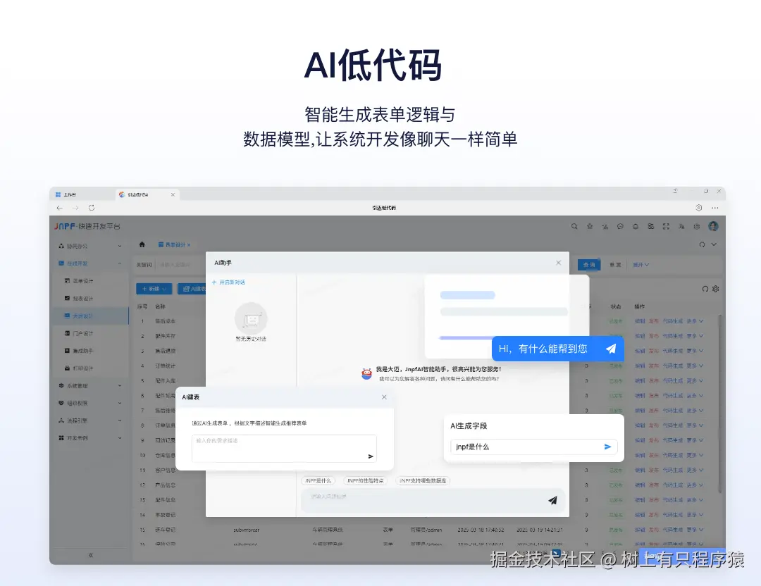 在这种背景下,以JNPF为代表的快速开发平台进入主流视野,就绝非偶然。它并非要取代前端开发者,而是提供了一种全新的、更高效的人机协作模式,直接回应了行业对于"提效"和"分层"的核心诉求。