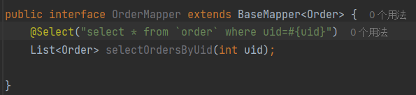 然后续写Order表的查询,在OrderMapper中查询所有目标uid的Order表内容。(注意此时我们的数据库表名order在数据库中是一个关键词,所以直接写表名order会查询失败,需要在order表框上双反引号` `,不要写成单引号;或者在Order实体类写上注解TableName指定查询表名)mybatis自动将 column = "id" 的user.Id列依次传值给uid,通过查询方法返回多个Order类对象,集成List集合,然后返回值给orders属性。