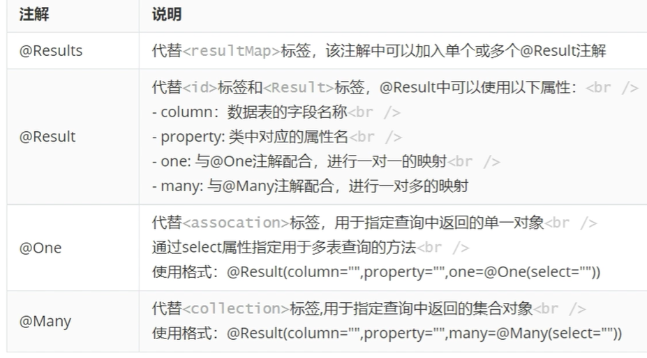id="userMap"用来让其他映射可以使用该Results规则,只在本方法中使用则不用加。property对应实体类中的属性,column对应数据库中的字段名,javaType写上List类型,对应返回的orders对象中一个用户可以有多个订单。many=@many:第一个many是固定语法,与@many组成一对多的的多表查询。select后面写上跨表查询的方法地址,注意得从com根目录开始写