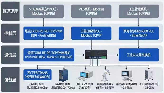 项目组全面调研车间现状,锁定80个压力控制关键点、40个伺服控制轴,确立压力控制精度±0.02%、伺服定位精度±0.01mm的核心目标。通讯架构以西门子S7-1500为核心搭建Profinet主干网,通过塔讯TX181网关完成跨协议转换,打通现场设备与上位系统的数据通道。