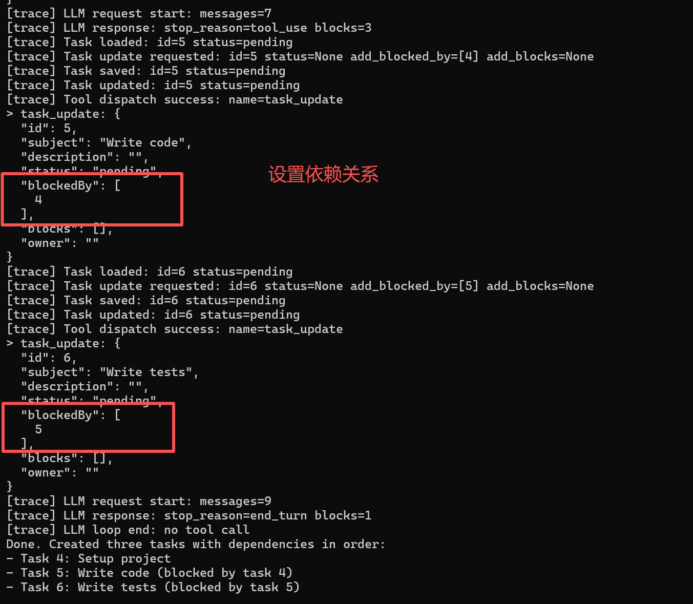 - 当状态被更新为 completed 时,触发 _clear_dependency,把这个已完成任务从其他任务的 blockedBy 中批量移除。