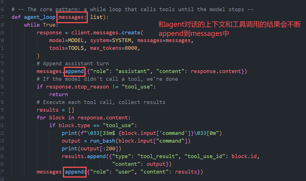 agent循环:会判断模型返回的内容有没有tool_use,如果有的话继续循环,没有退出