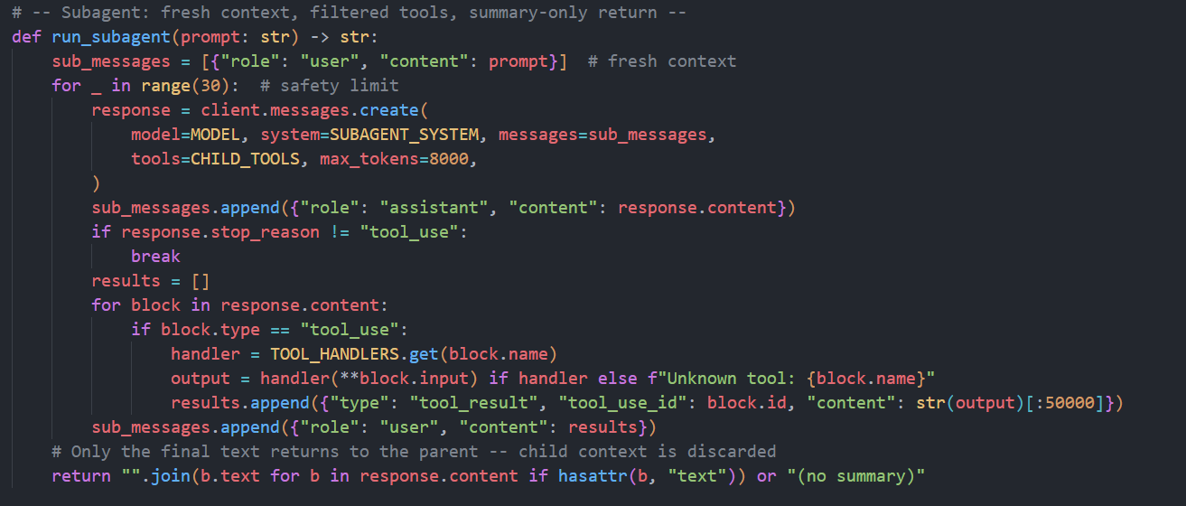 再看 run_subagent:父 agent 调用 task 后,不是在当前 messages 里继续,而是新建 sub_messages=[{"role": "user", "content": prompt}],也就是从空上下文启动一个子循环。子 agent 只拿 CHILD_TOOLS(故意不包含 task,避免递归套娃),在自己的循环里执行工具、回填 tool_result,直到 stop_reason 不再是 tool_use。最后只把"最终文本总结"返回给父 agent。