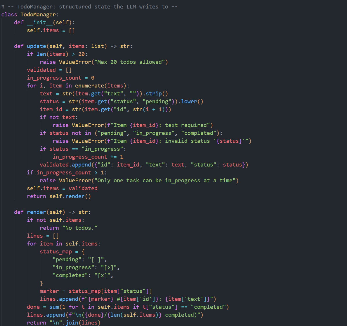 这里的 todo 工具 schema 很关键:它要求模型一次性提交 items 数组,而不是"只更新一条"。items 的每个元素必须是 object,且必须包含 id、text、status 三个字段;status 只能是 pending / in_progress / completed 三选一。也就是说,模型每次调用 todo 都是在"重写当前任务视图",而不是打补丁。这个约束让计划状态保持结构化、可校验,也方便后续做 reminder 注入和状态统计。