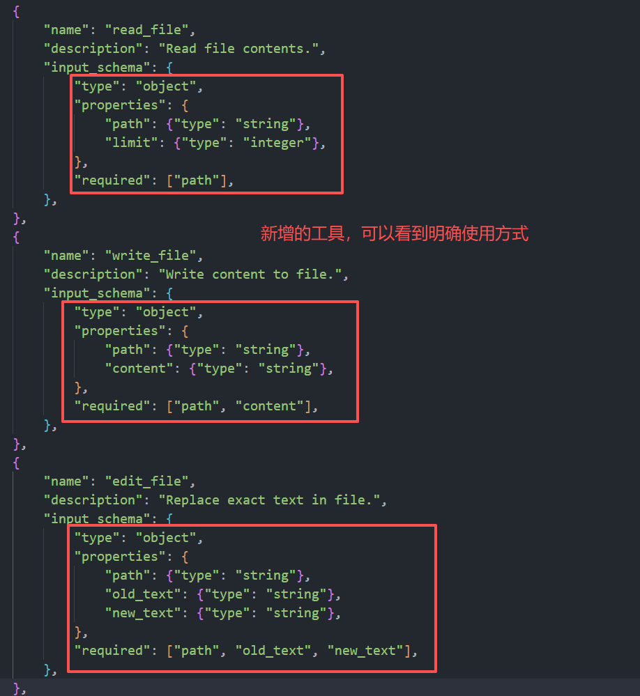 第二章也很简单,只是增加了工具的数量,在发送内容的tools(如上图)中告诉模型有哪些工具可以调用,并且明确工具的调用格式。这个"格式"其实就是每个工具都带一个 input_schema(JSON Schema 子集):先声明 type=object,再给出 properties(参数名和类型),最后用 required 规定必填项。比如 bash 要求 {"command": "string"},read_file 要求 path 必填、limit 可选,edit_file 则强制 path/old_text/new_text 三个字段都要给。模型如果少传字段、字段类型不对,或者传了 schema 以外的数据,都会在执行前被 API 拦截。这消除了一整类错误:模型无法传递格式错误的输入,因为 API 会在执行前校验 schema。这也使模型的意图变得明确------当它用特定字符串调用 edit_file 时,不存在关于它想修改什么的解析歧义。具体的工具还可以用沙箱来约束安全性,用一个dispatch map注册这些工具,再加一个handler来分派映射: