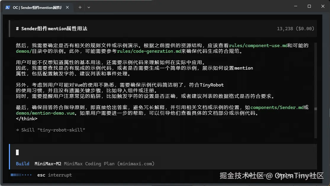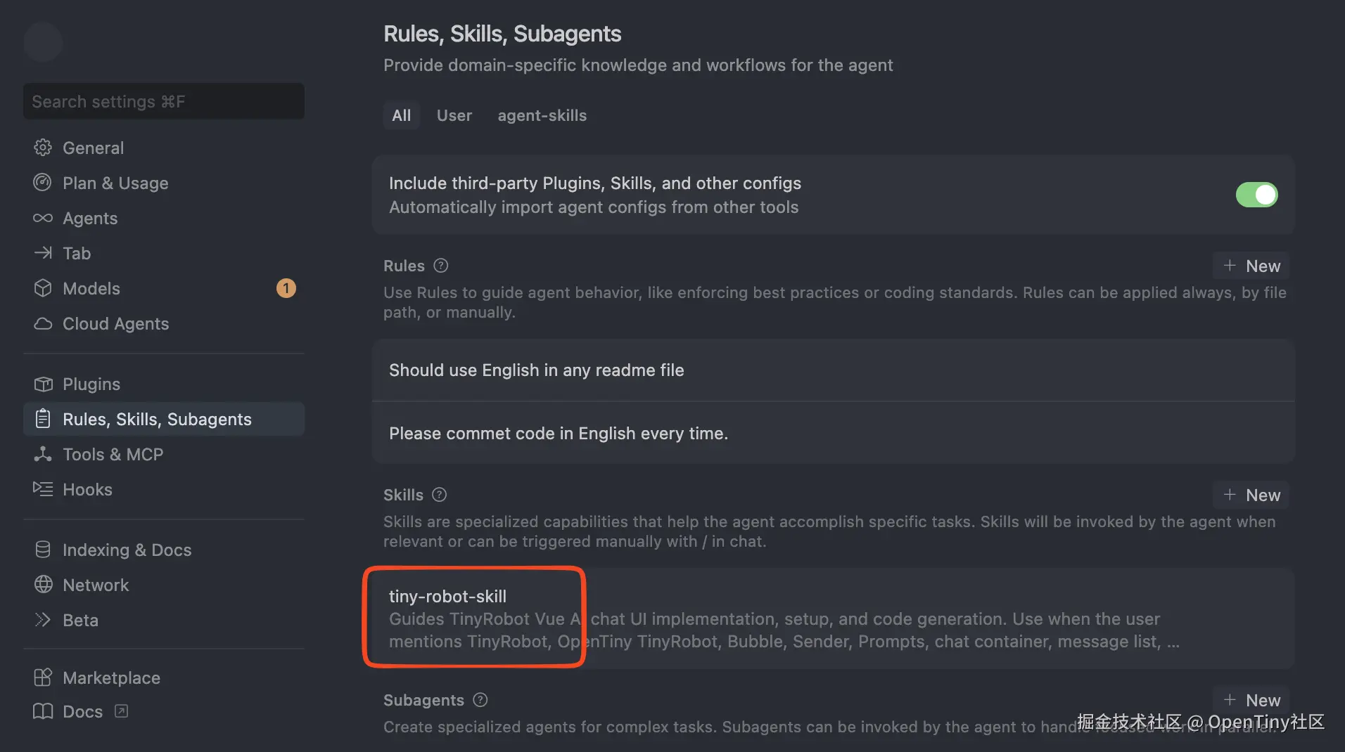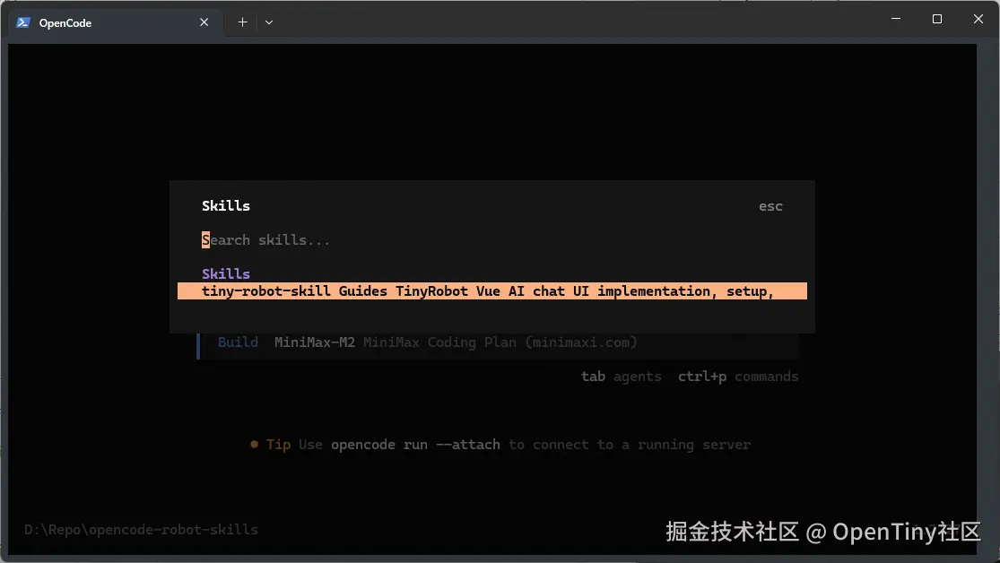 下面介绍 Cursor 和 OpenCode 中使用 TinyRobot Skills 的使用方式。