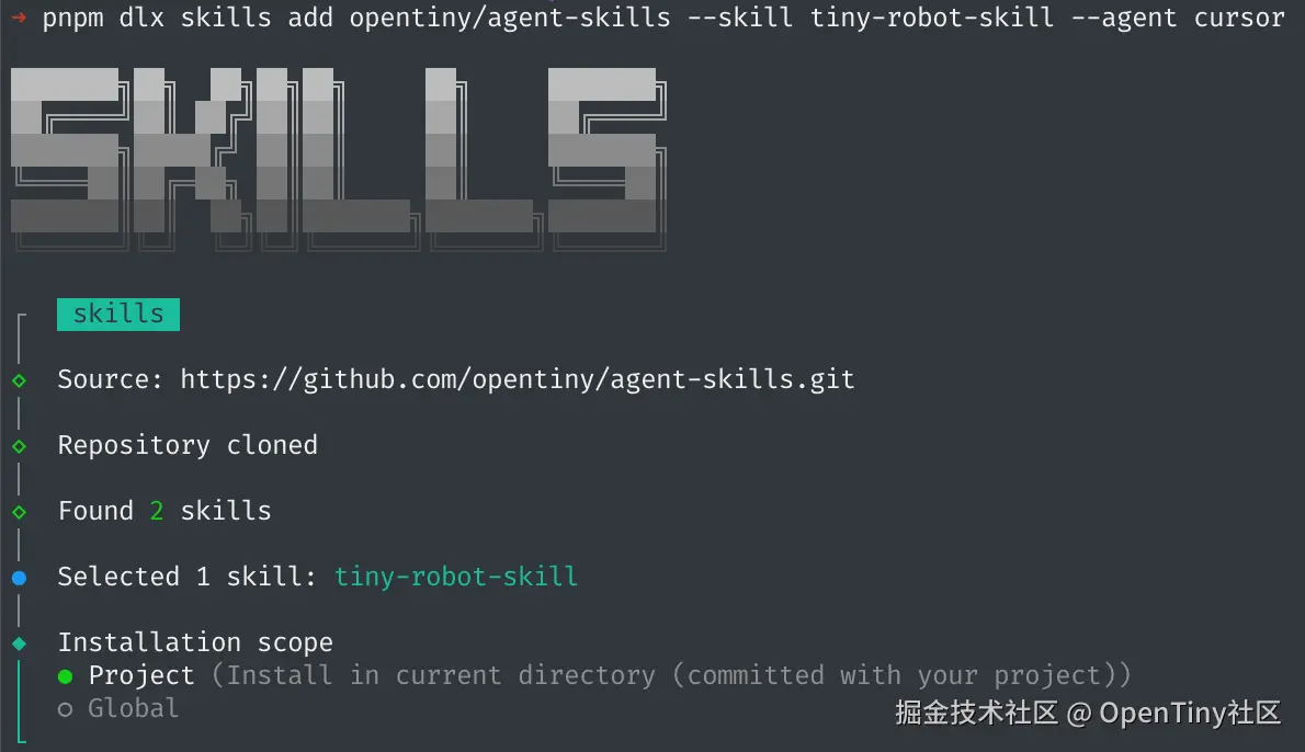 pnpm dlx skills add opentiny/agent-skills --skill tiny-robot-skill --agent cursor