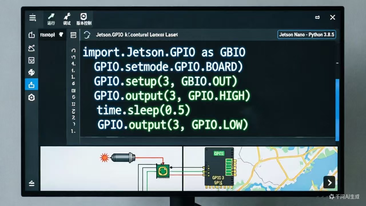 - 硬件保护:高功率激光器务必通过MOSFET或继电器隔离控制,避免反向电动势损坏Jetson。