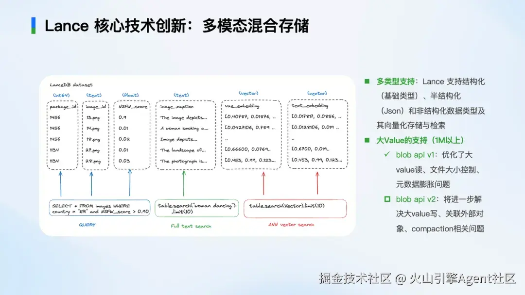 上图是 Lance 的存储逻辑。比如说在 LanceDB dataset 里边可以看到有不同的数据存储列:Int 型、文本型、Float 型和 Vector 存的向量,这些都可以在一张表里进行管理和存储。Lance 既支持对标量数据进行 SQL 查询,也支持针对向量的 Vector search 以及文本查询。