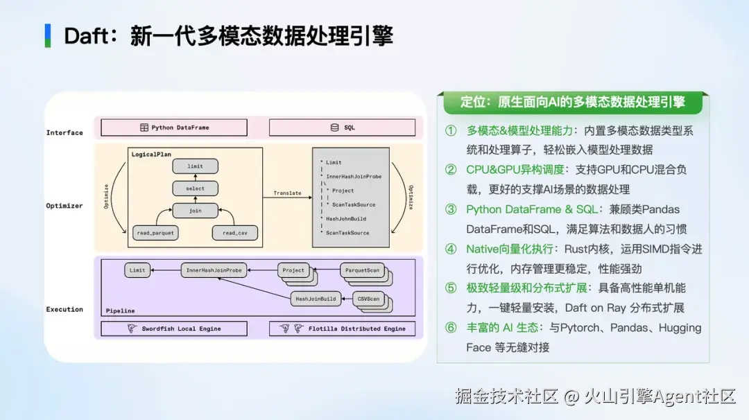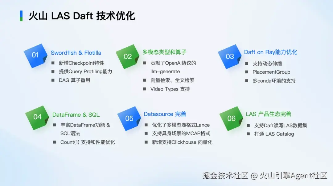 首先是对算子能力的增强和补齐;支持 Daft 两种底层计算引擎;支持原生 shuffle 操作、 dataframe 和 SQL 操作;此外,火山引擎还将 Daft 与 LAS Catalog 进行了有效打通。