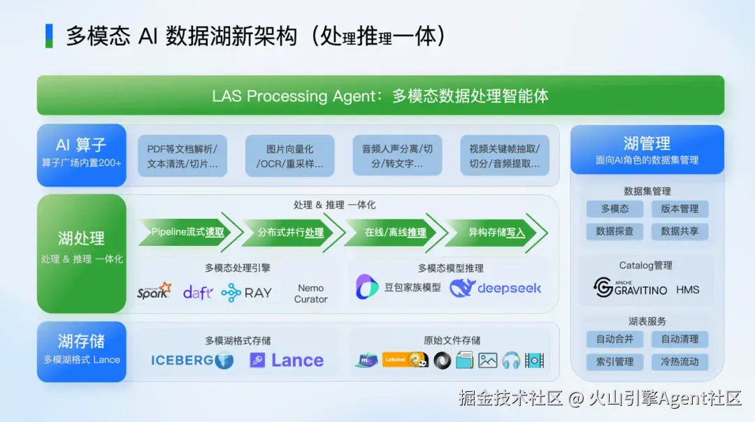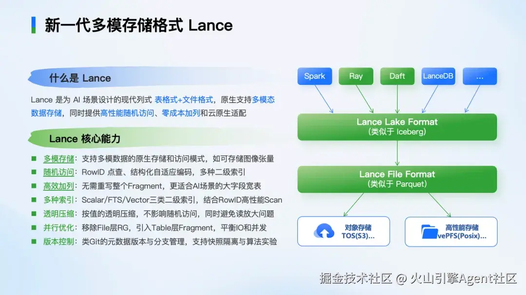 在存储层面,新方案引入 Lance Format,依托数据湖平台 LAS 实现元数据与数据血缘的自动管理,用户无需再手动维护索引和关系信息。通过数据入湖、分层存储等能力,进一步提升了数据治理的效率与规范性。