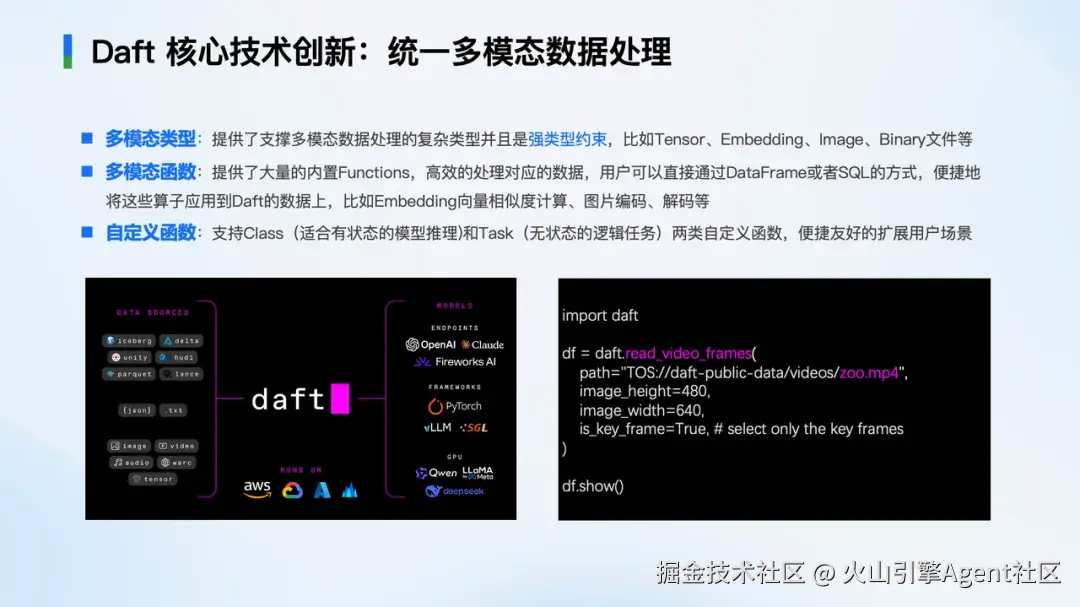 Daft 已在主流云厂商中上线,可以结合不同模型。图中是通过 Daft 创建的 DataFrame 示例。通过简单的几行代码,就可以把视频文件、图片文件有效的加载进去。