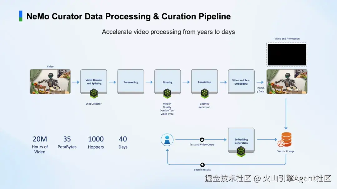 图中是通过 NeMo Curator 来处理视频数据的过程,相同的操作流程、同样的视频时长和同样的数据规模,在使用 1, 000 张 Hopper GPU 进行计算后,耗时从之前的 3.4 年的压缩到 40 天。大大缩短了模型训练的整个周期。