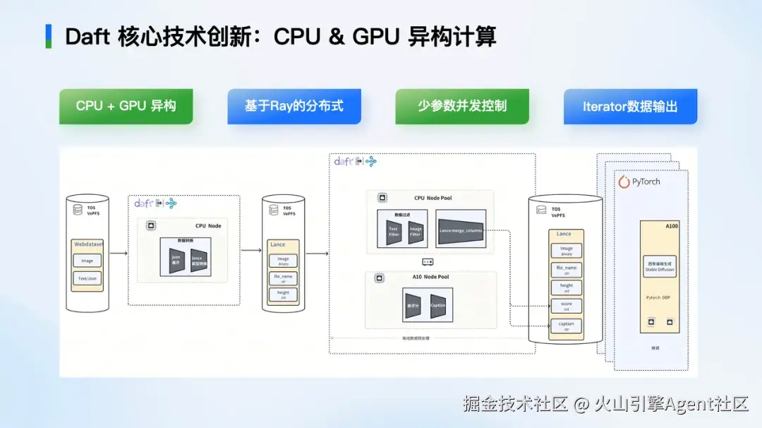 Daft 和 Ray 都可以调度 GPU 和 CPU 的算力,同时进行分布式计算和数据处理,其结果直接通过 PyTorch 进行模型训练。