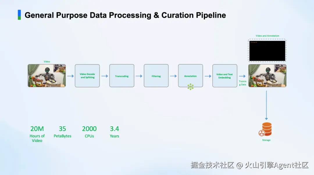 图中是通过 General Purpose 来处理视频数据的过程。左侧是原视频,通过视频的解码和切分、转码和过滤之后,对关键帧进行标注,最后进行视频和文本的嵌入,从而完成对整个视频的处理工作。