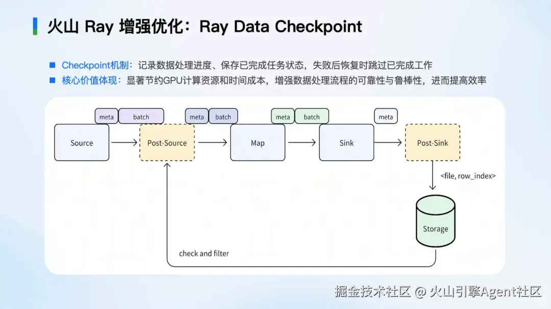 在火山引擎对 Ray 的优化中,一项重要的增强是引入了 Ray Data Checkpoint 机制,这是开源 Ray 中不具备的能力。