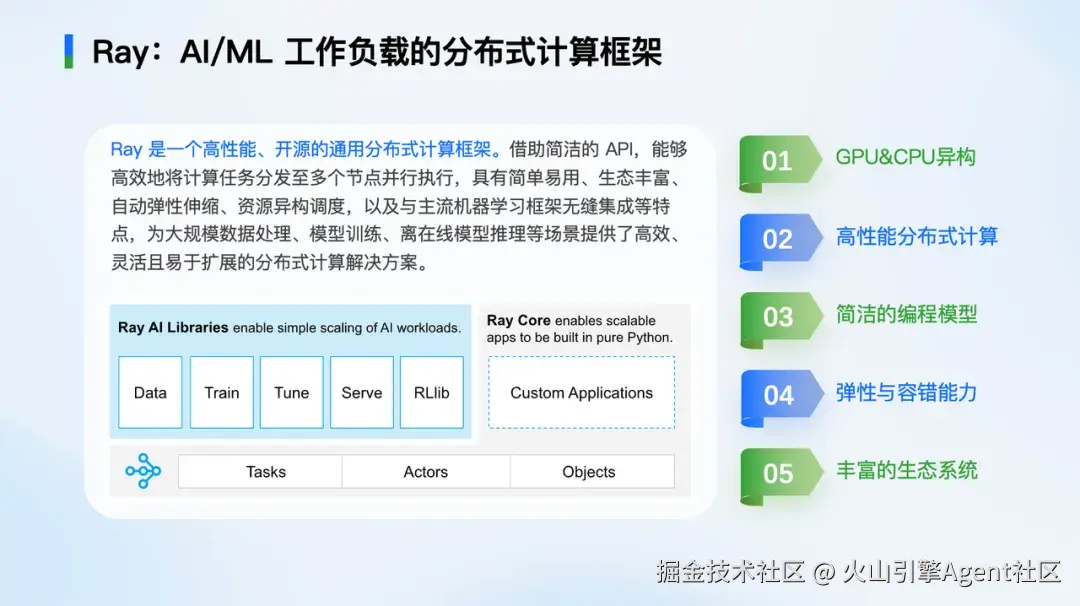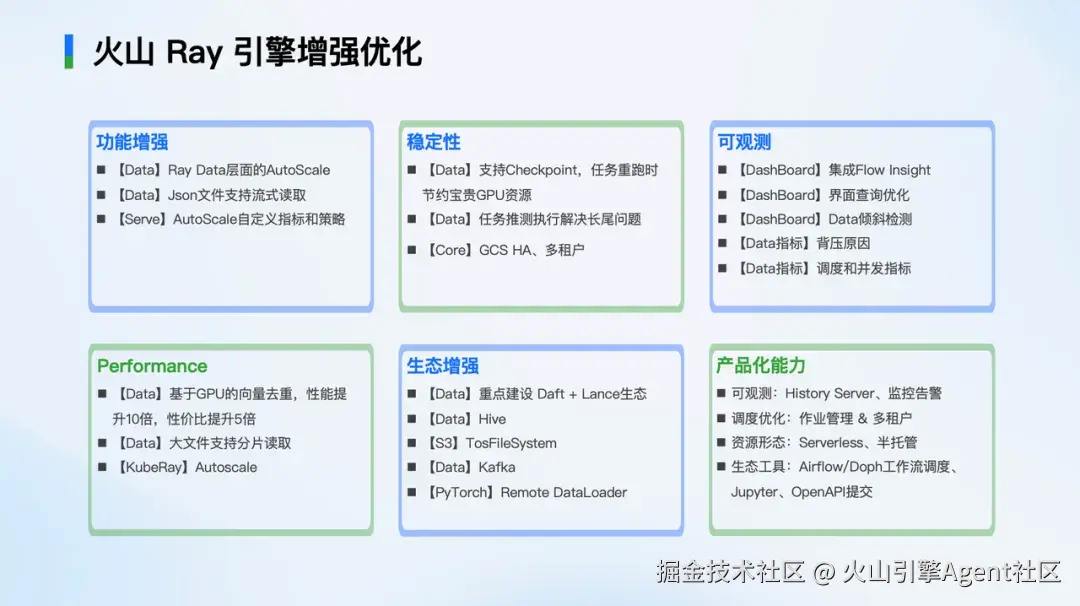 火山引擎 Ray 同样在多个关键方向上进行了增强与优化,主要包括系统稳定性、计算性能、可观测性以及运维能力等方面的提升。