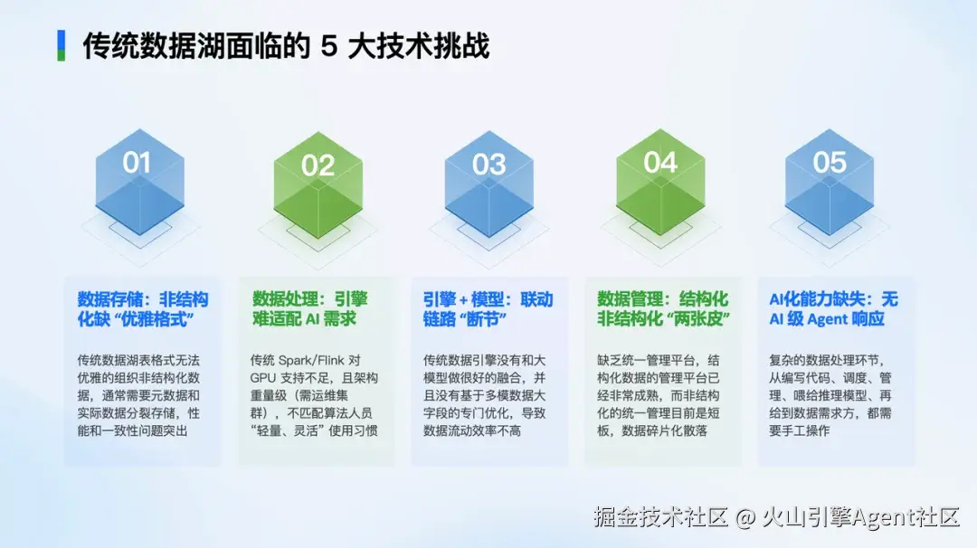 过往的传统的数据湖主要是围绕结构化数据来进行管理和计算,因此在 AI 时代,传统的数据湖将面临图中五大挑战。