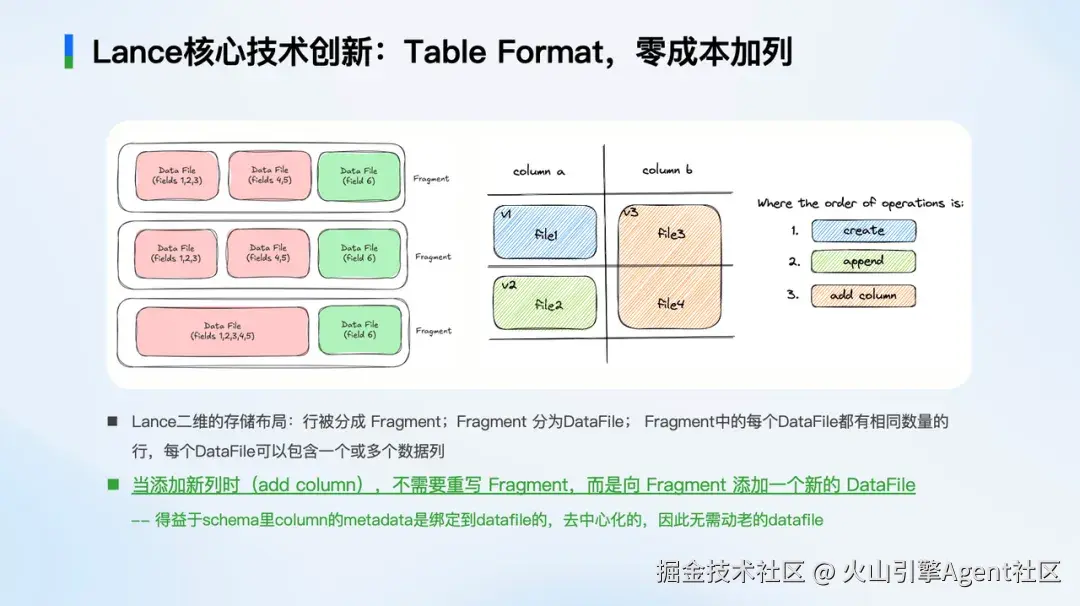 在 Lance 添加新列时(add column),不需要重写 Fragment,而是向 Fragment 添加一个新的 DataFile。如图所示,当我们有了 column a 的时候,我们可以看到在 V1、V2 这两个版本里边分别是两个文件,那当我们想加 column b 的时候,我们只需要写一个新的 V3 文件,这个列就被加上了,达成需依赖于比较良好的文件和 table format 的隔离。
