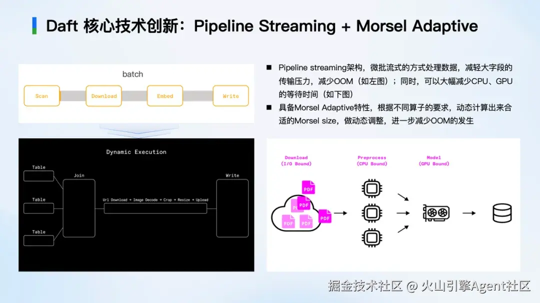 在数据处理过程中,Daft 采用了 Pipeline 执行模型,并结合了 Morsel 动态执行机制。根据不同数据处理的算子要求,对Morsel 进行动态调整,从而有效避免数据的 OM。基于 Pipeline 的执行方式,Daft 可以优化数据处理工作流的整体调度,减轻数据处理传输压力。