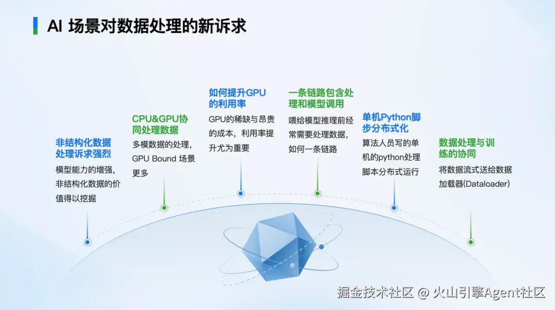 在 AI 处理数据的场景下,新的诉求主要包括非结构化数据的价值挖掘、 GPU 的联合调度使用率,以及在数据处理过程中的数据计算和模型调用。