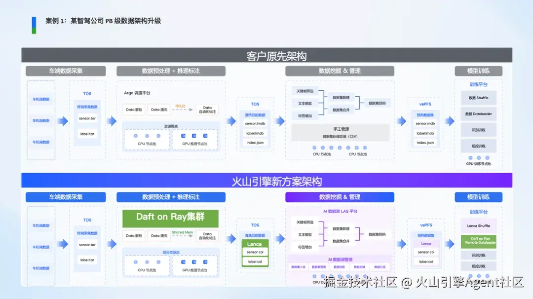 引入火山引擎的新方案后,采用了基于 Ray 与 Daft 构建的统一集群,替代原有的 Argo 调度平台。新架构能够更高效地调度资源,实现对数据的清洗、拆解与打包等操作。核心优势在于,新方案显著提升了 GPU 与 CPU 的资源调度,同时迁移路径相对平滑,开发者只需进行适量的代码修改就可以实现,即可从原本依赖手动管理的分布式执行框架,转变为自动且有容错能力的分布式异构资源调度框架。
