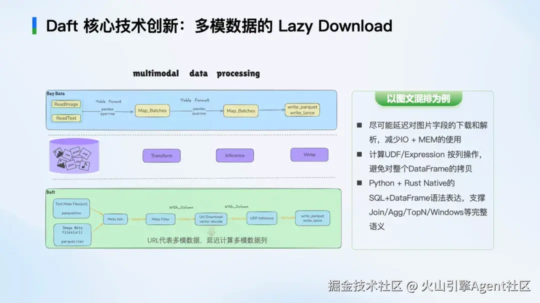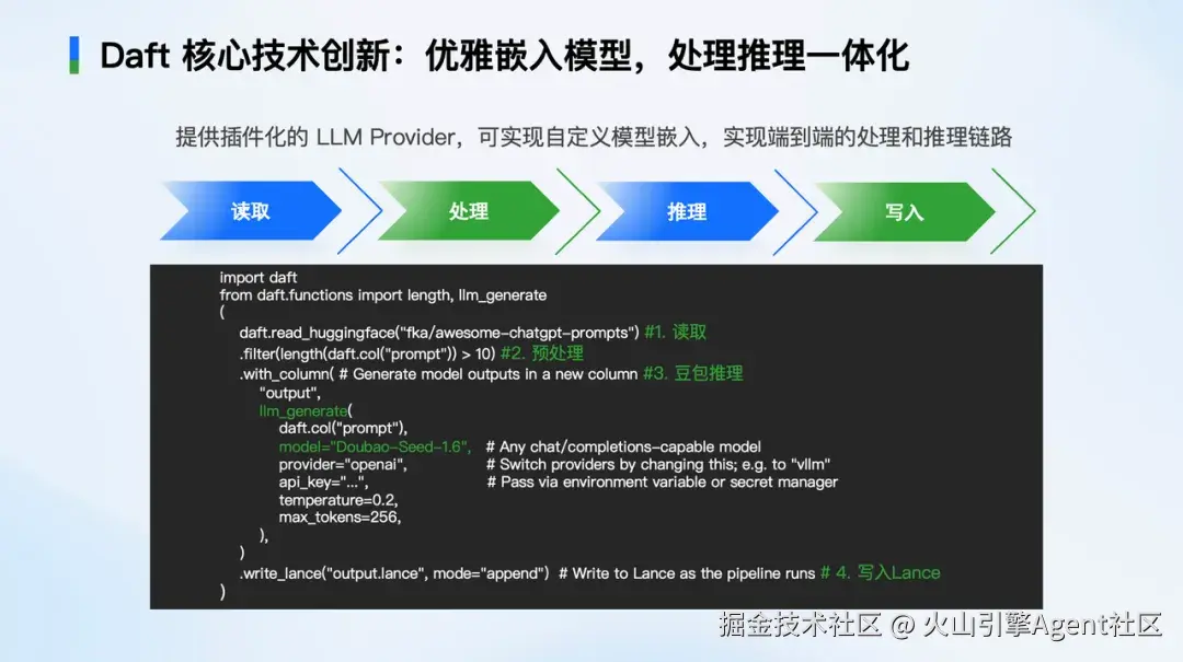 Daft 比较优雅的嵌入了数据处理和推理模型,图中代码示例:通过 read huggingface 进行数据读取和数据过滤,可以同时调用我们的火山引擎的豆包模型进行推理,实现对多模态数据处理的加工,同时写入 Lance Format。