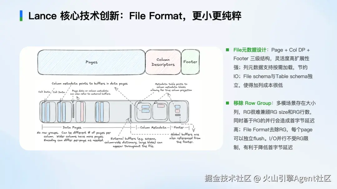 File Format 通过 Page + Col DP + Footer 三级结构设计,灵活度高、扩展性强;列元数据支持按需加载,从而节约 IO;File schema 与 Table schema 独立,使得加列成本很低。通过并行计算,移除 Group 不会影响到 I/O,有利于大幅降低对首字节的延迟。