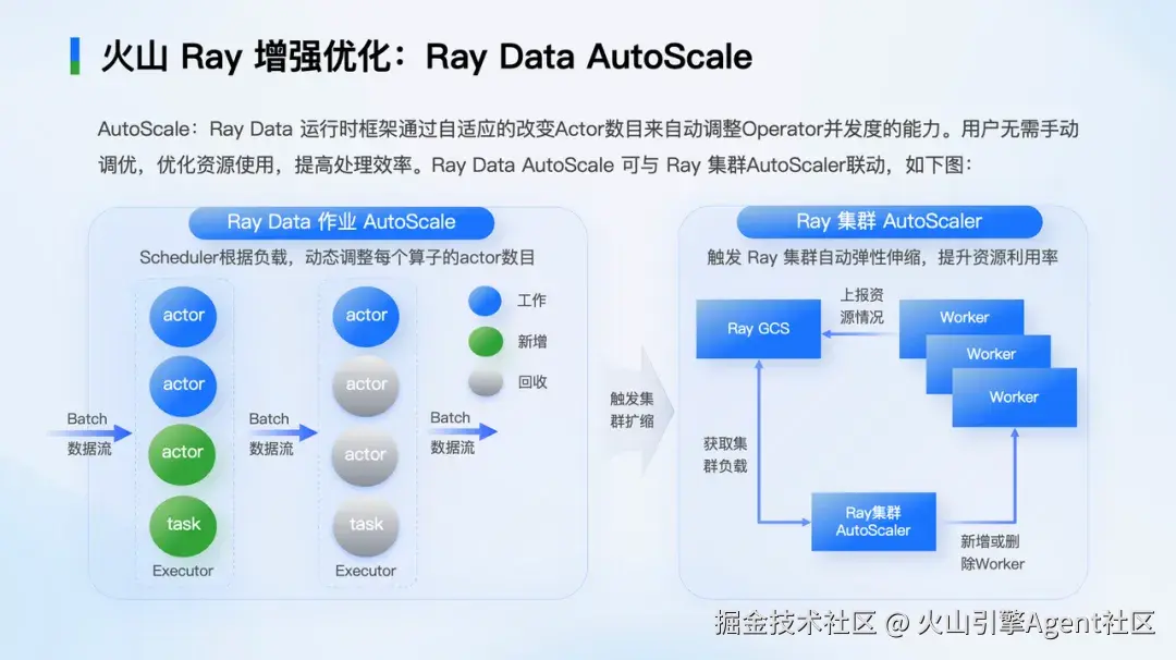 图片右半部分展示了 Ray 集群 AutoScaler 联动,在数据处理的过程中,系统能够根据不同的数据处理需求,在读取数据阶段动态扩展 Actor 的数量,从而实现数据的弹性计算。