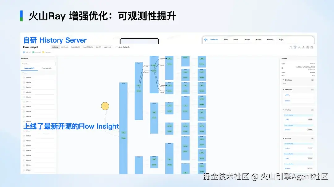 在可观测性方面,火山引擎针对 Ray 原生的 History Server 存在的性能瓶颈进行了专项优化,并上线了 Flow Insight 能力。该能力能够在大量数据计算任务并发执行的情况下,仍保持 UI 的连续与稳定运行。