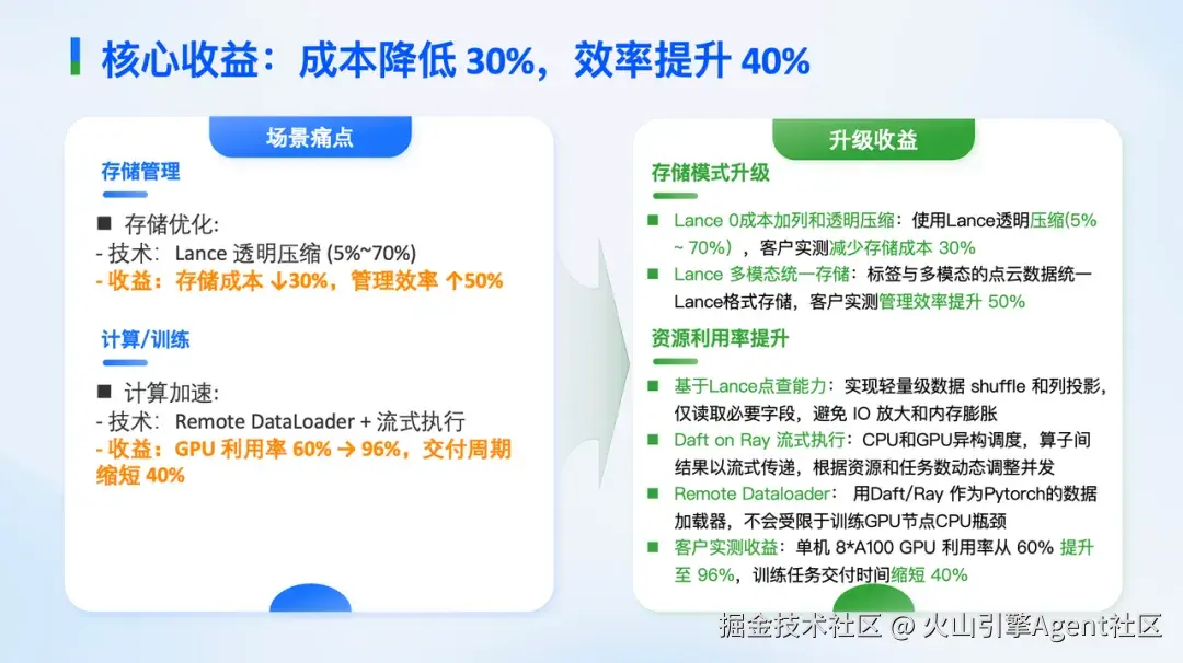 通过以上解决方案,客户的数据的成本降低了 30%,而管理效率提升了 50%。通过 Remote Data Loader,客户的 GPU 资源也得到了大幅提升,从 60% 上升到 96%,资源交付的数据交付周期缩短 40% 以上。