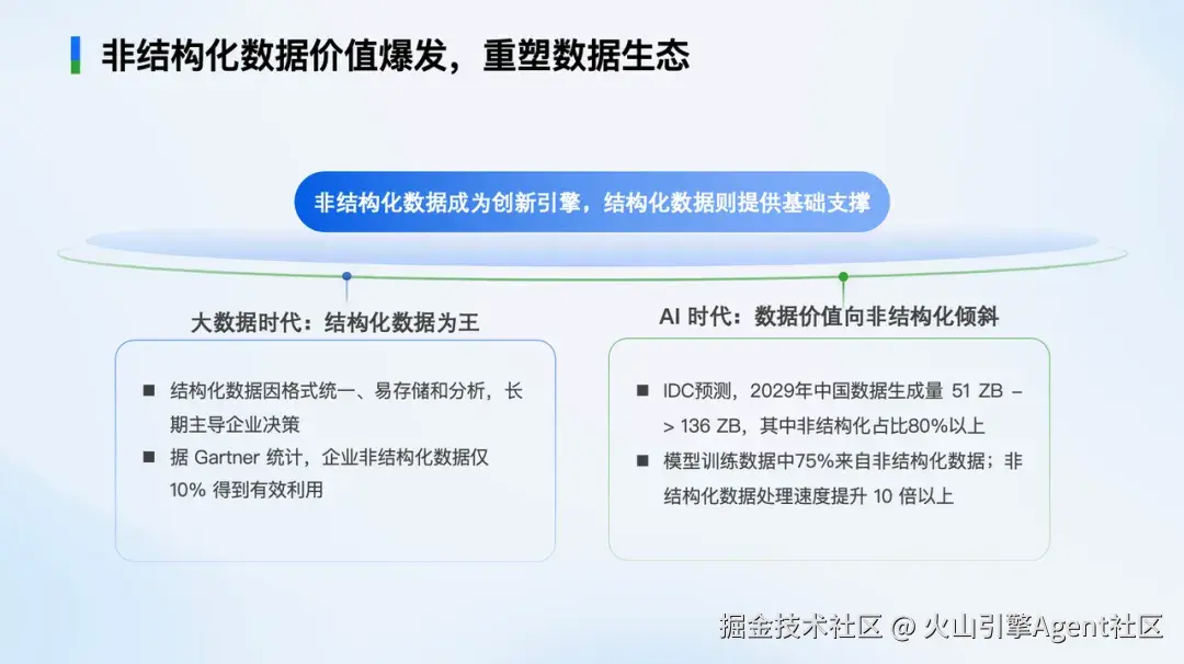 在 AI 时代,非结构化数据价值被迅速明确,正在重塑数据生态,正逐渐成为新的创新引擎。而在过往的大数据时代,企业主要围绕结构化数据来进行的计算、存储、加工和分析,主导业务增长和决策。