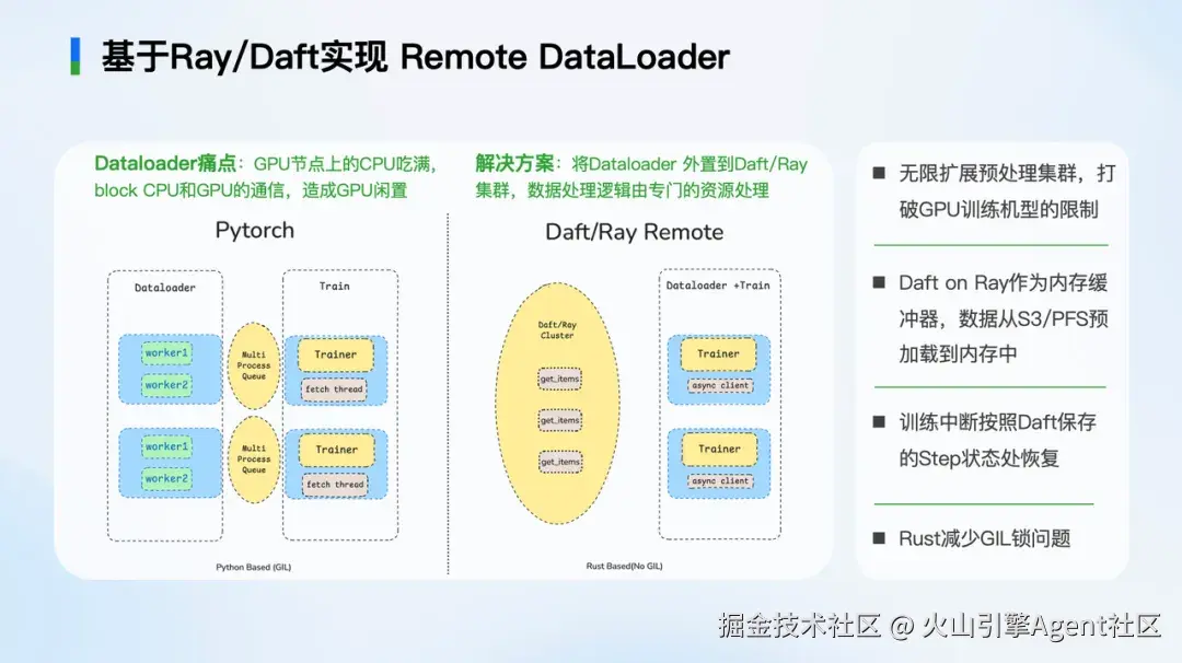 针对这一问题,火山引擎通过部署外置的 Ray 与 Daft 集群,有效的分隔了 GPU 和 CPU 的算力,同时通过我们的 Remote Data Loader 可以实现数据的有效加载,实现数据处理集群在 CPU 集群的无限扩展,避免了 GPU 训练空置。